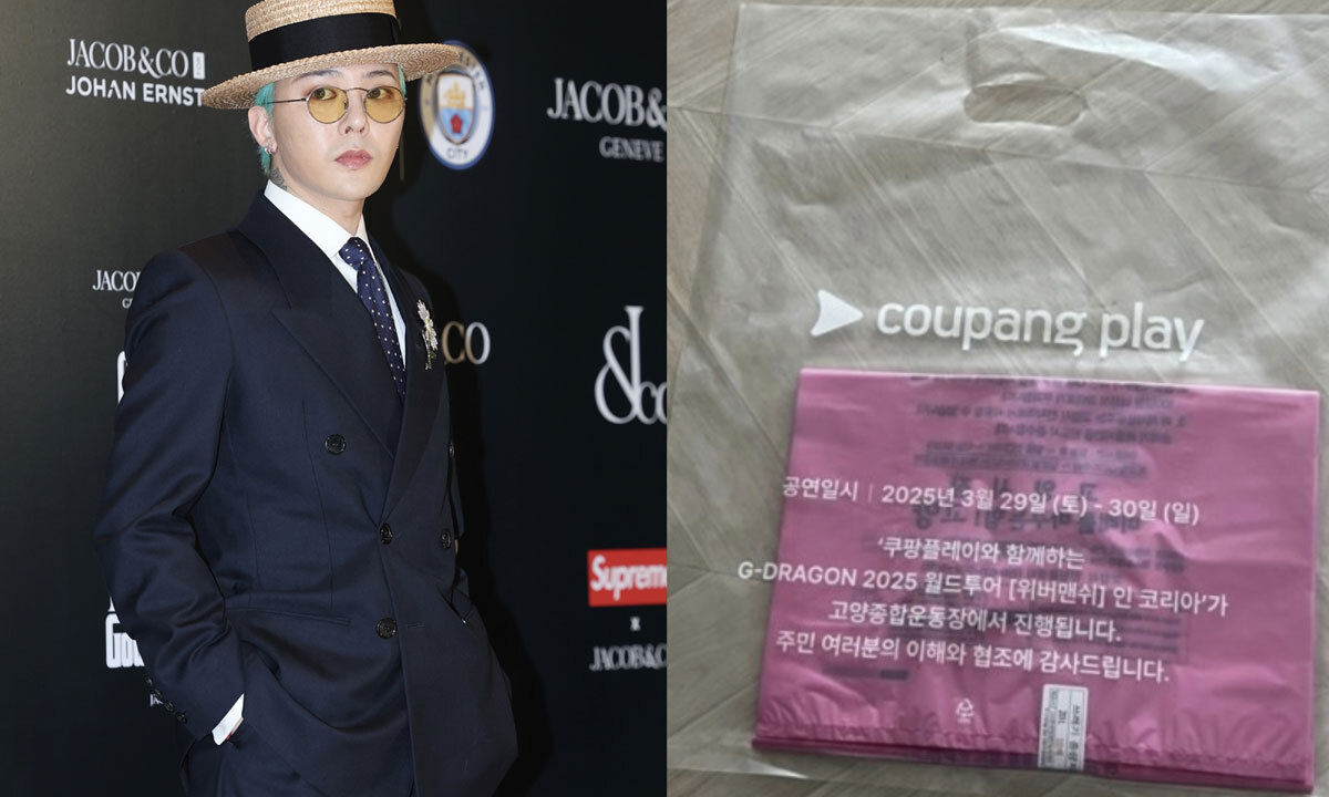 공개된 사진에는 종량제봉투가 담긴 투명 봉투에 “쿠팡플레이와 함께하는 지드래곤 2025 월드투어 위버맨쉬 인 코리아가 고양종합운동장에서 진행된다. 주민 여러분의 이해와 협조에 감사드린다”는 문구가 적혀 있다.