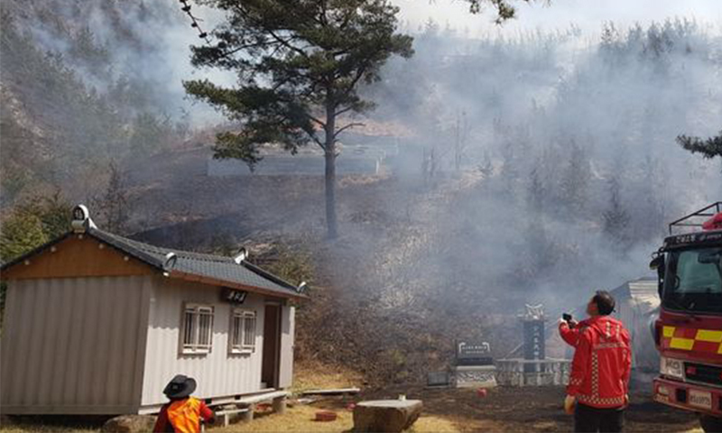 신고받고 출동한 소방 당국이 곧바로 진화 작업을 벌였지만, 인근 산으로 불이 번져 장비 13대와 헬기 6대를 투입해 1시간 45분만인 오후 1시 20분쯤 불길을 잡아냈다.