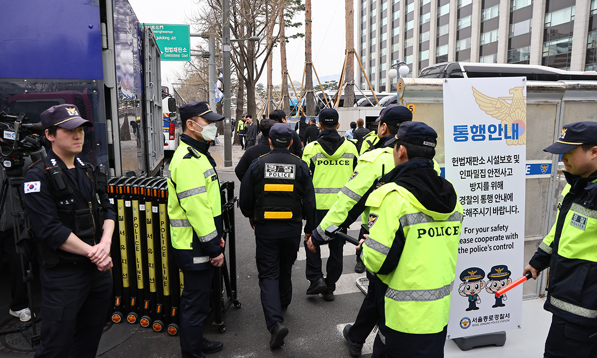 경찰청은 선고일 전국 경력 100%를 동원하는 ‘갑호비상’을 발령한다. 서울에만 전국 기동대의 60% 수준인 210개 부대, 1만4000여명이 집중 배치된다. 헌법재판소 반경 100m는 출입이 통제된 진공상태로 유지하고 탄핵 찬반 단체간 충돌을 막는 완충지대가 설정된다.
