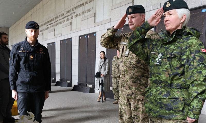 우리 합참의장에 해당하는 제니 캐리냥 캐나다 국방참모총장(육군 대장)이 5일 서울 용산 전쟁기념관을 찾았다. 캐나다 역사상 첫 여성 국방참모총장인 그는 6·25 전사자 명비를 찾아 헌화한 뒤 거수경례로 참전용사들을 기렸다. 캐나다는 전쟁 기간 미국, 영국에 이어 3번째로 많은 2만6700여명의 장병을 한국에 보냈으며 그중 516명이 전투 도중 목숨을 잃었다.