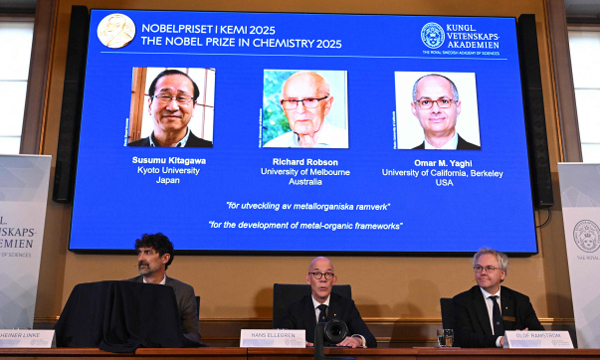 스웨덴 왕립과학원 노벨위원회는 8일(현지시간) 금속·유기 골격체를 개발한 스스무 기타가와 일본 교토대 교수와 리처드 롭손 호주 멜버른대 교수, 오마르 M. 야기 미국 버클리캘리포니아대 교수에게 노벨화학상을 수여한다고 발표했다.