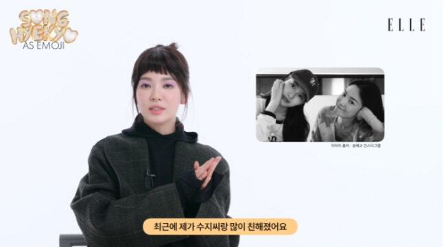 당시 송혜교는 “수지 씨랑 많이 친해졌다. ‘청룡시리즈어워즈’ 핸드프리팅 행사 끝나고 저희 집에 와서 시간을 보내기도 했다. ‘청룡시리즈어워즈’ 시상이 있었는데 그날도 끝나고 만났다. 둘이 수다 떨고 헤어졌다”라며 웃었다.
