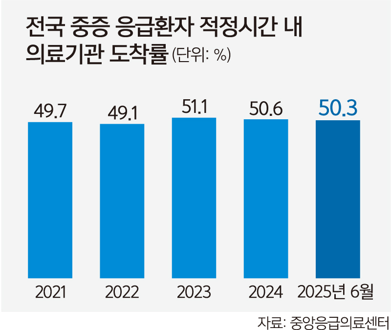 12일 국민의힘 한지아 의원이 국립중앙의료원 중앙응급의료센터로부터 제출받은 자료에 따르면 지난해 심근경색·뇌졸중·중증외상 3대 급성기 중증 응급환자 14만4054명 중 50.6%(7만3147명)가 적정시간(골든타임) 내 응급실에 도착해 입원 치료를 받았다. 질환별 적정시간은 심근경색이 발병 후 2시간 이내, 출혈성·허혈성 뇌졸중은 발병 후 3시간 이내, 급성 중증외상은 발병 후 1시간 이내로 규정돼 있다.