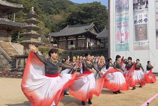 12일 전남 구례군 마산면 화엄사 보제루 앞에서 열린 ‘제2회 지리산대화엄사 구례군 라인댄스 동호인대회’에서 참가자들이 라인댄스(여러 명의 사람이 줄을 지어서 동일한 동작을 하는 춤)를 추고 있다. 대한불교조계종 지리산대화엄사는 ‘바람이 물을 스칠 때’를 주제로 10∼12일 ‘제21회 화엄문화제’를 개최했는데 마지막 날인 12일에는 라인댄스 동호인대회와 함께 ‘제5회 어머니의 걷기대회’ 등이 펼쳐졌다.