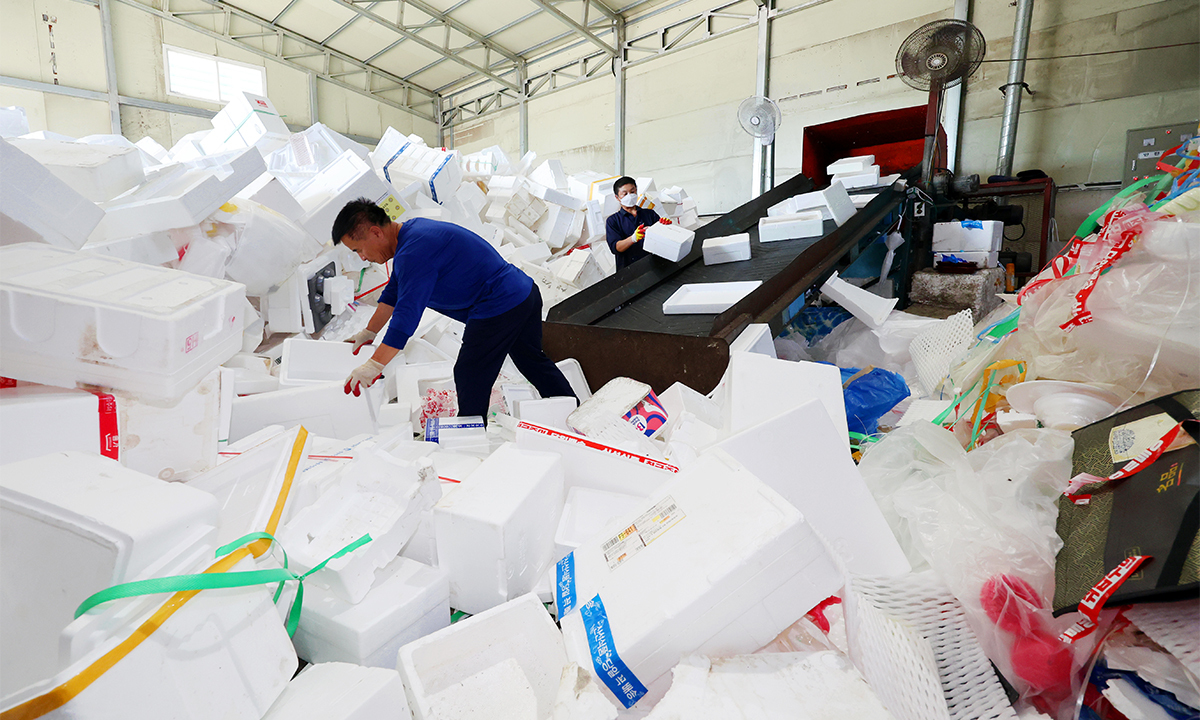추석 연휴 뒤 첫 평일인 10일 광주광역시 북구 월출동 한 재활용 쓰레기 선별장에서 관계자들이 연휴 기간 쏟아져 나온 스티로폼을 처리하고 있다. <연합>연합> Copyright ⓒ 세계일보. 무단 전재 및 재배포 금지
