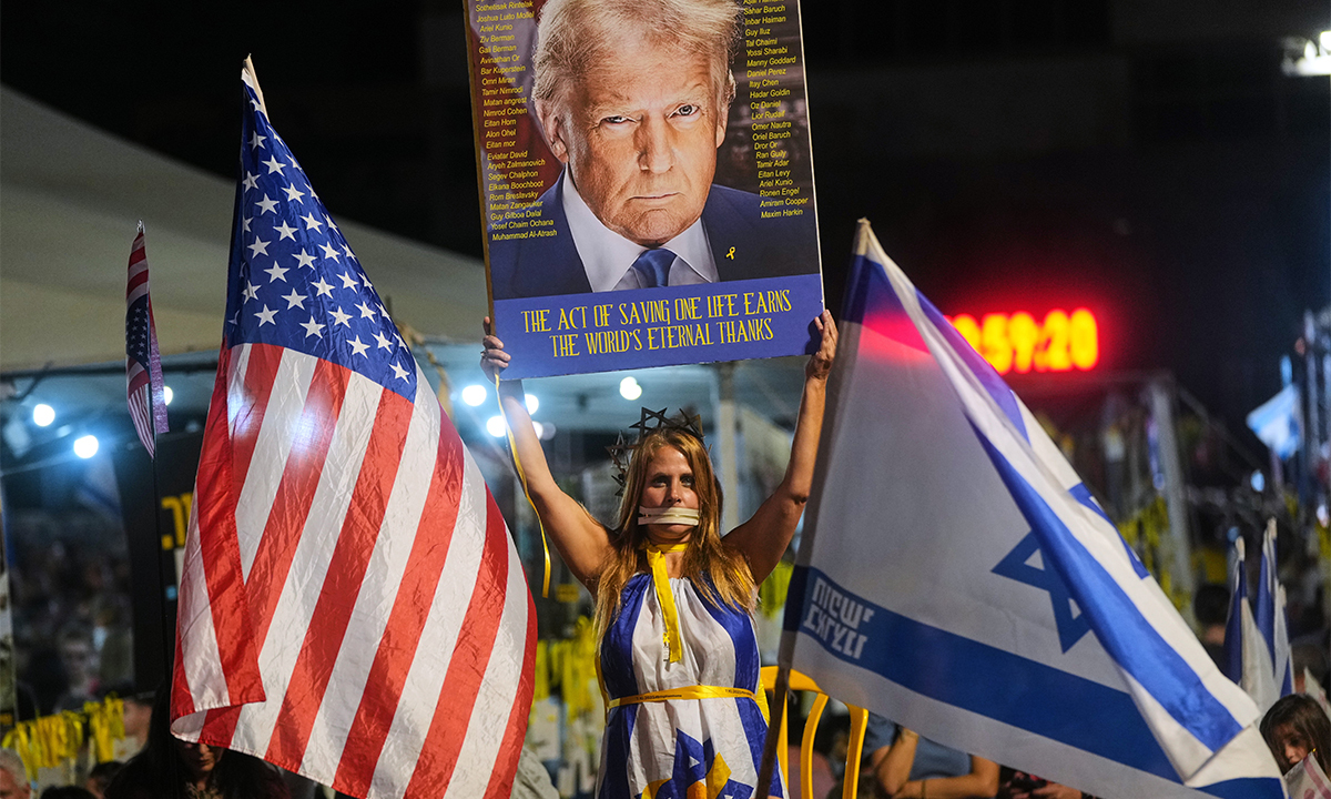 하마스에 억류된 이스라엘 인질들의 석방이 다가오는 가운데 11일(현지시간) 이스라엘 텔아비브의 광장에서 열린 집회에 참석한 한 여성이 도널드 트럼프 미국 대통령의 사진을 들고 있다. 이날 집회에는 트럼프 대통령의 딸 이방카 트럼프와 사위 재러드 쿠슈너, 스티브 위트코프 미 중동 특사도 함께했다.