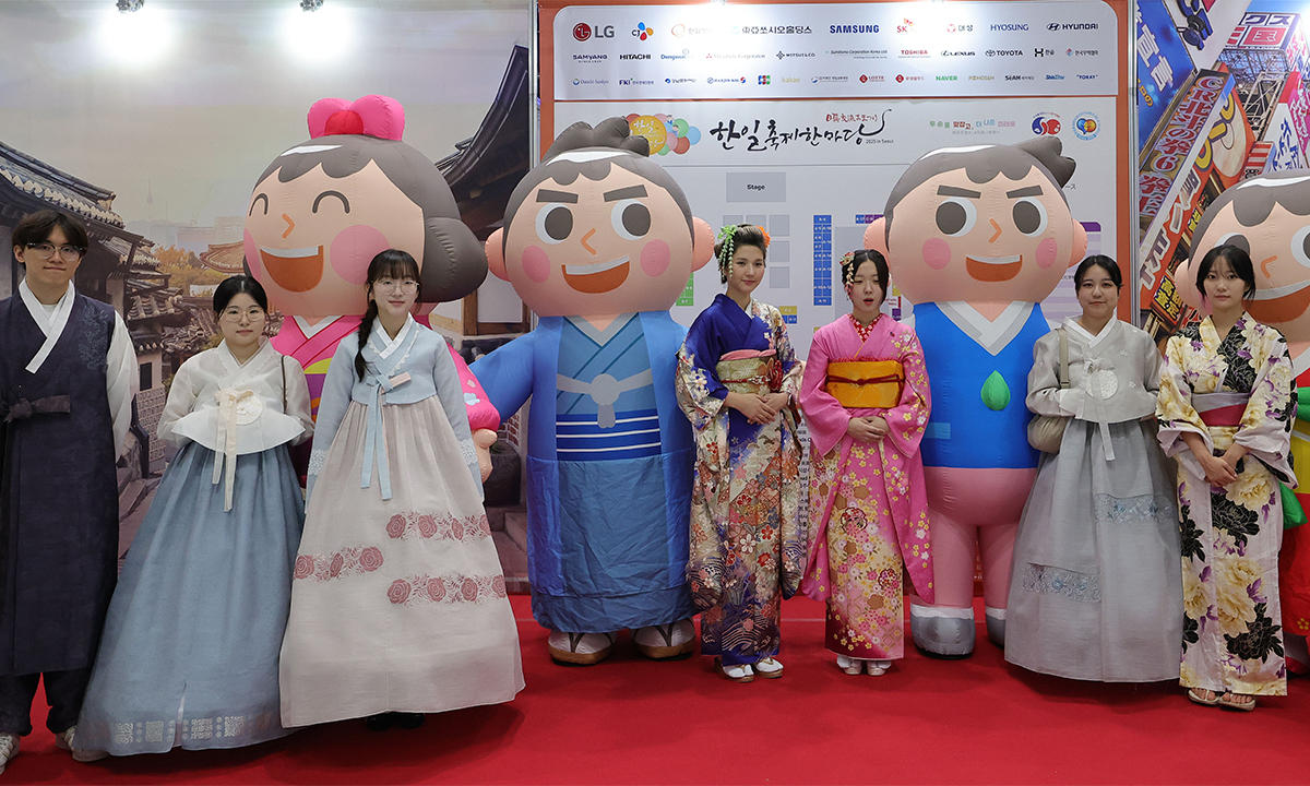 12일 서울 강남구 코엑스에서 열린 ‘한일축제한마당 2025’에서 관람객들이 양국 전통 의상을 입고 기념촬영을 하고 있다. 2005년 시작된 한일축제한마당은 양국의 우호 증진을 위한 한·일 최대 민간 교류 행사다. 올해 행사는 한·일 국교 정상화 60주년을 기념해 마련됐다.