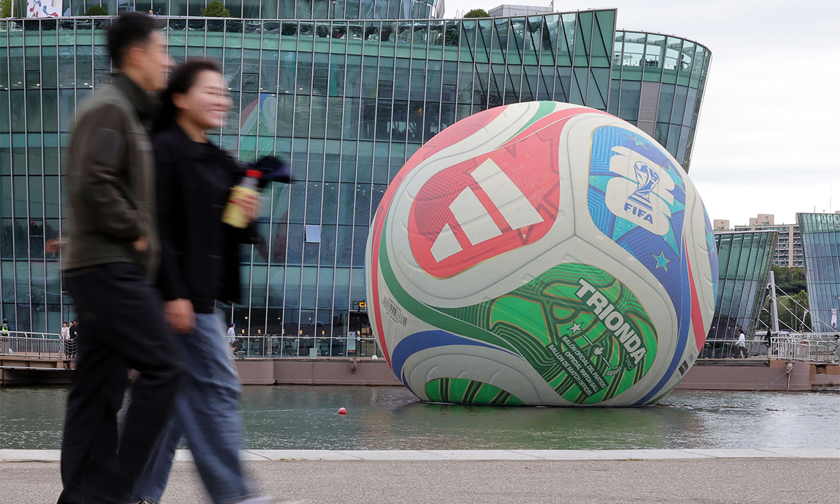 12일 서울 서초구 한강시민공원 세빛둥둥섬에 2026년 국제축구연맹(FIFA) 북중미 월드컵의 공인구 아디다스 ‘트리온다’(TRIONDA)가 설치돼 있다. ‘세 개’(Tri)의 ‘파도’(Onda)라는 뜻의 트리온다는 월드컵 공동 개최국인 캐나다·멕시코·미국을 기념하는 디자인으로 제작됐다.