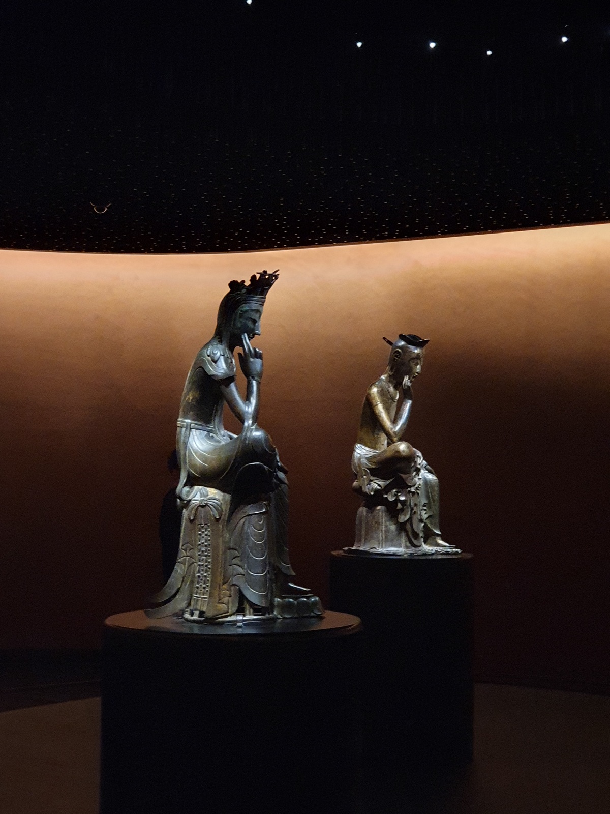 코너를 돌면 드디어 먼 발치에 두 점의 불상이 모셔진 사유의 방이 한눈에 들어오는데, 공간은 초현실적으로 설계되어 미세하게 기울어진 벽과 바닥을 통해 관람객이 반가사유상을 올려다보도록 유도한다. 이러한 설계 덕분에 마음이 자연스럽게 편안해지고 긴장이 풀린다. 또 낮은 조도와 반짝이는 천장, 은은한 조명 등이 공간을 감싸며, 외부의 소음과 시선을 최소화하여 관람객이 부처의 사유에 몰입하도록 돕는다. 평범한 전시 공간에서 한 발 더 나가 불상과 마주하며 마음을 정화하는 수행적 공간으로 느껴지는 것이다. 관람객이 많지 않은 평일에 가면 마치 법당에 앉아 기도하는 시간처럼 조용한 명상의 장이 조성된다는 평도 많다.