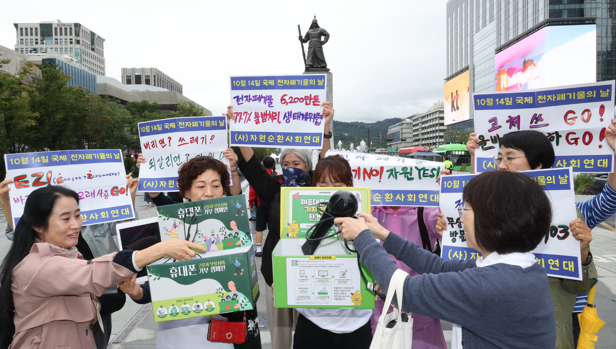'국제 전자폐기물의 날'을 하루 앞둔 13일 서울 종로구 광화문광장 이순신동상 앞에서 자원순환사회연대 활동가들이 전자폐기물의 올바른 배출과 재사용을 알리는 'EZ(Ewaste+Zerowaste) GO! GO!' 캠페인을 하고 있다.
