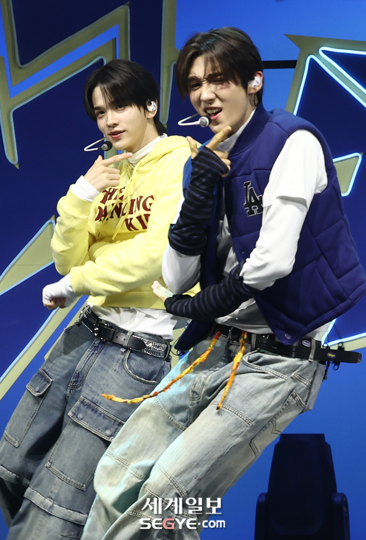 그룹 투어스가 13일 서울 광진구 광장동 예스24 라이브홀에서 열린 미니 4집 ‘play hard’(플레이 하드)의 쇼케이스에 참석해 열띤 공연을 펼치고 있다.