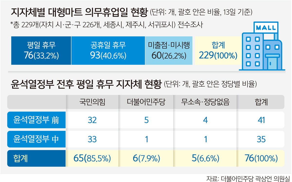 일례로 윤석열정부 약 3년(2022년 5월∼2025년 4월) 동안 대형마트 의무휴업일을 평일로 바꾼 지자체는 35곳인데, 그중 33곳(94.3%)이 국민의힘 소속 단체장의 지역이었다. 특히 윤석열정부가 지난해 1월 대형마트 공휴일 의무휴업 폐지 방침을 밝힌 이후 휴업일을 평일로 전환한 지자체 22곳 중 21곳이 국민의힘 단체장 지역이었다.
