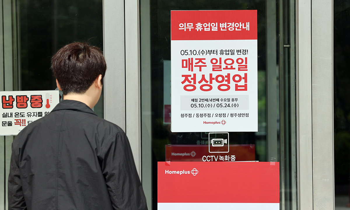 2023년 5월 한 대형마트에서 시민이 출입문에 붙은 휴업일 변경 안내문을 보고 있다. 연합뉴스
