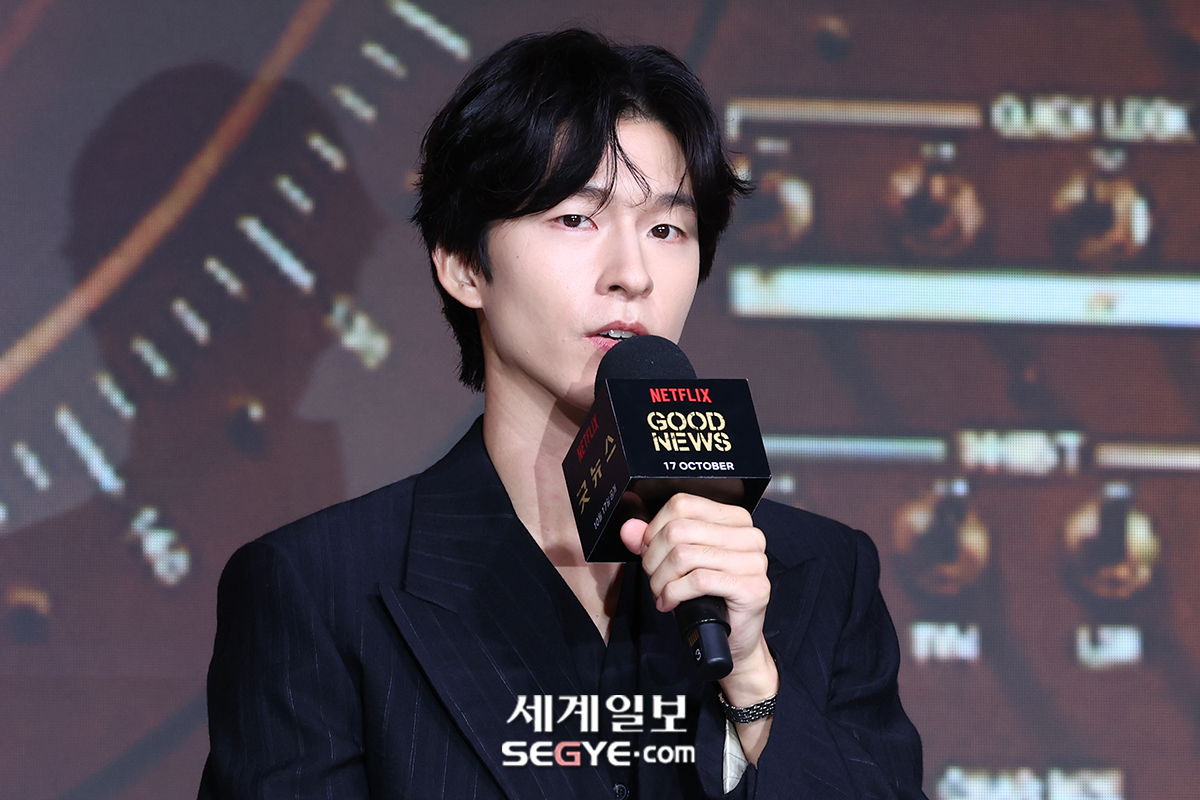 배우 홍경이 14일 JW 메리어트 동대문 스퀘어 서울에서 열린 넷플릭스 영화 ’굿뉴스’의 제작발표회에 참석해 인사말을 하고 있다.