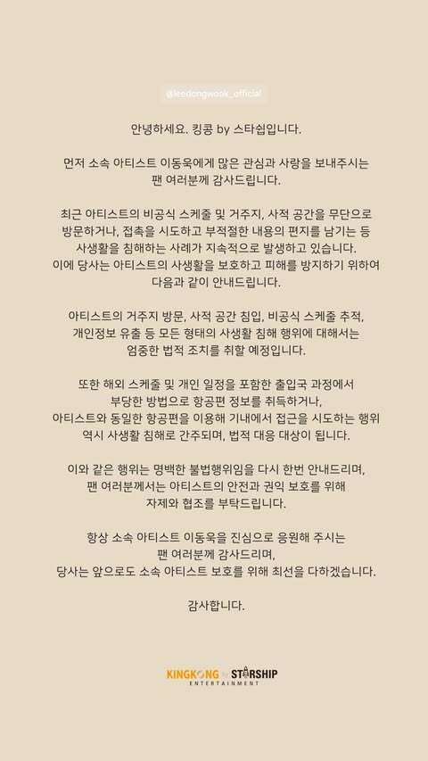14일 이동욱의 소속사 킹콩 by 스타쉽은 공식 SNS를 통해 “최근 이동욱의 비공식 스케줄, 거주지, 사적 공간을 무단으로 방문하거나 접촉을 시도하고 부적절한 내용의 편지를 남기는 등 사생활을 침해하는 사례가 지속적으로 발생하고 있다”며 말문을 열었다.