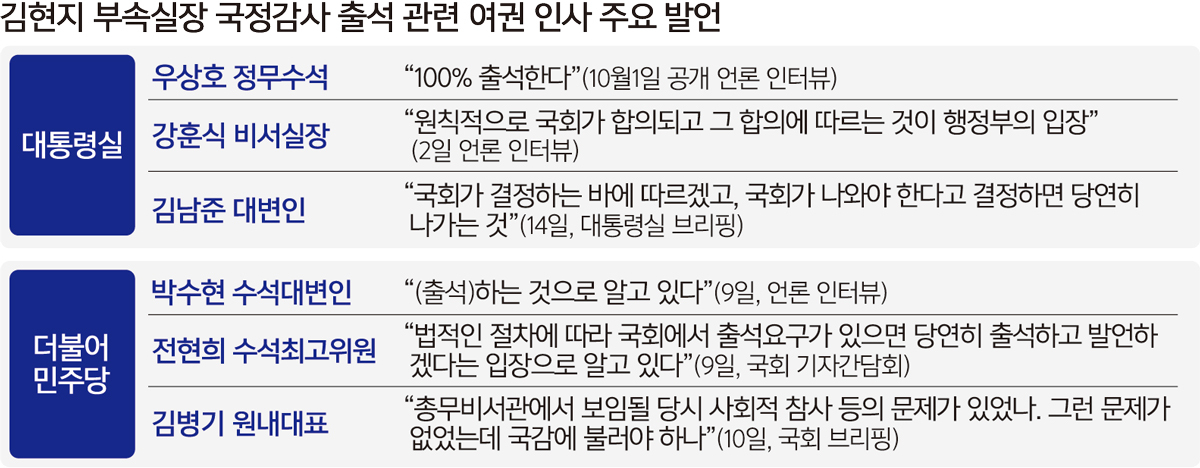 이 대통령이 이날도 국감 협조를 당부하면서 논란이 지속하는 김 부속실장의 국감 출석에도 힘이 실리는 것이 아니냐는 관측도 나온다. 김남준 대통령실 대변인은 이날 브리핑에서 김 부속실장의 국감 출석 여부와 관련한 질문에 “국회가 결정하는 바에 따르겠고, 국회가 나와야 한다고 결정하면 당연히 나가는 것이고 그 기조에 변함이 없다”고 말했다. 우상호 정무수석은 지난 1일 언론 인터뷰에서 “100% 출석한다”고 밝힌 바 있다.