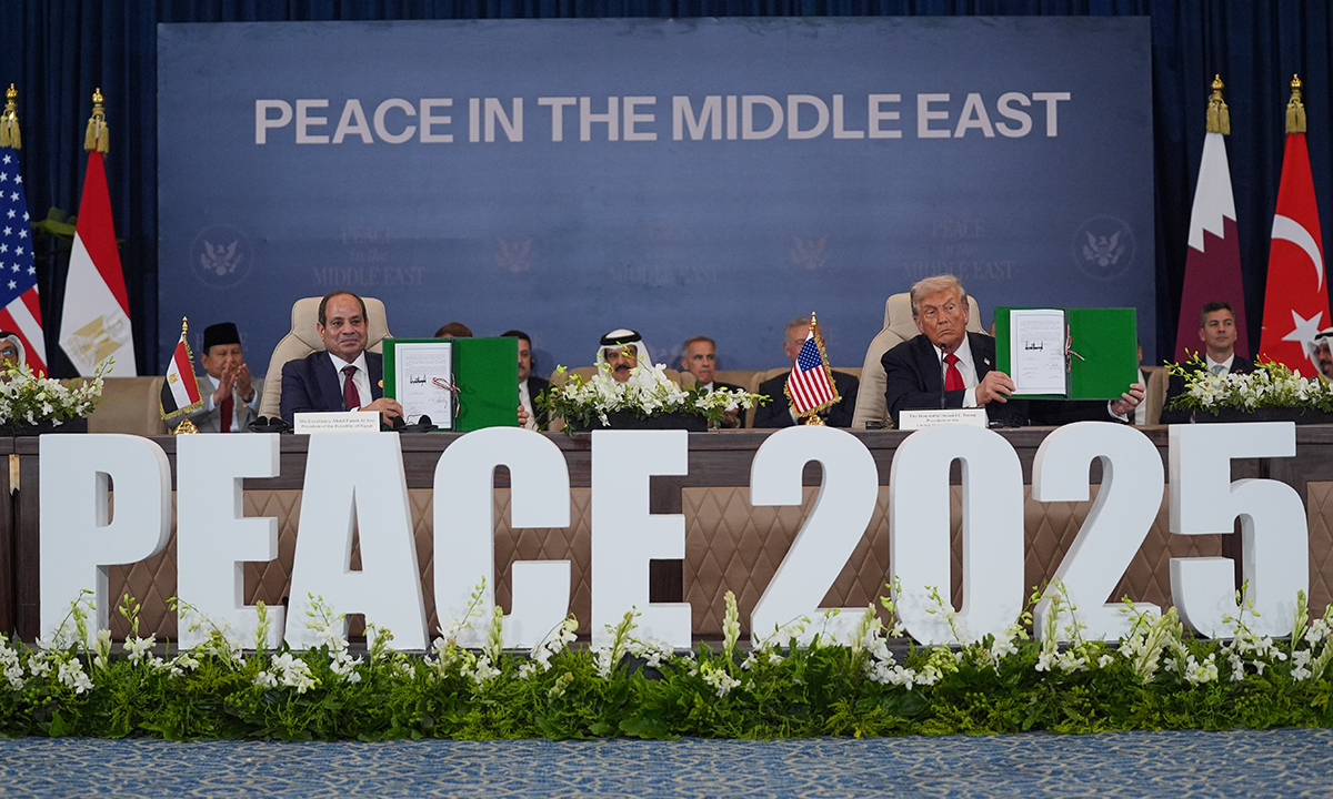 도널드 트럼프 미국 대통령(앞줄 오른쪽)과 압델 파타 엘시시 이집트 대통령이 13일(현지시간) 이집트 샤름엘셰이크에서 열린 가자지구 평화 정상회의에서 휴전 중재국 정상과 함께 서명한 ‘가자평화선언문’을 들어 보이고 있다. 트럼프 대통령은 “마침내 중동에 평화가 찾아왔다”고 선언했다