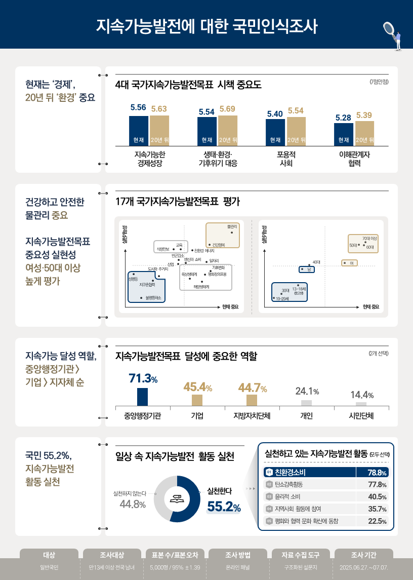 지속가능발전의 핵심 주체로는 중앙행정기관(71.3%), 기업(45.4%), 지방자치단체(44.7%)가 주요하게 꼽혔다. 실제 노력도 평가에서는 시민단체가 5점 만점에서 3.27점을 기록해 가장 높았고, 이어 중앙행정기관(3.13점), 개인(3.08점), 기업(3.06점), 지자체(3.01점) 순이었다. 인식과 평가 사이에 괴리가 있었던 것으로 풀이된다. 세부 목표 17개 가운데는 ‘건강하고 안전한 물관리’, ‘건강하고 행복한 삶 보장’이 현재와 미래 모두 중요하고 실현 가능성이 높은 과제로 꼽혔다. 반면 ‘불평등 해소’, ‘성평등 보장’, ‘지구촌 협력 강화’는 중요도와 실현성 모두 낮게 평가됐다. 아울러 국민의 절반 이상(55.2%)은 ‘지속가능발전 실천 활동에 참여하고 있다’고 응답했다.