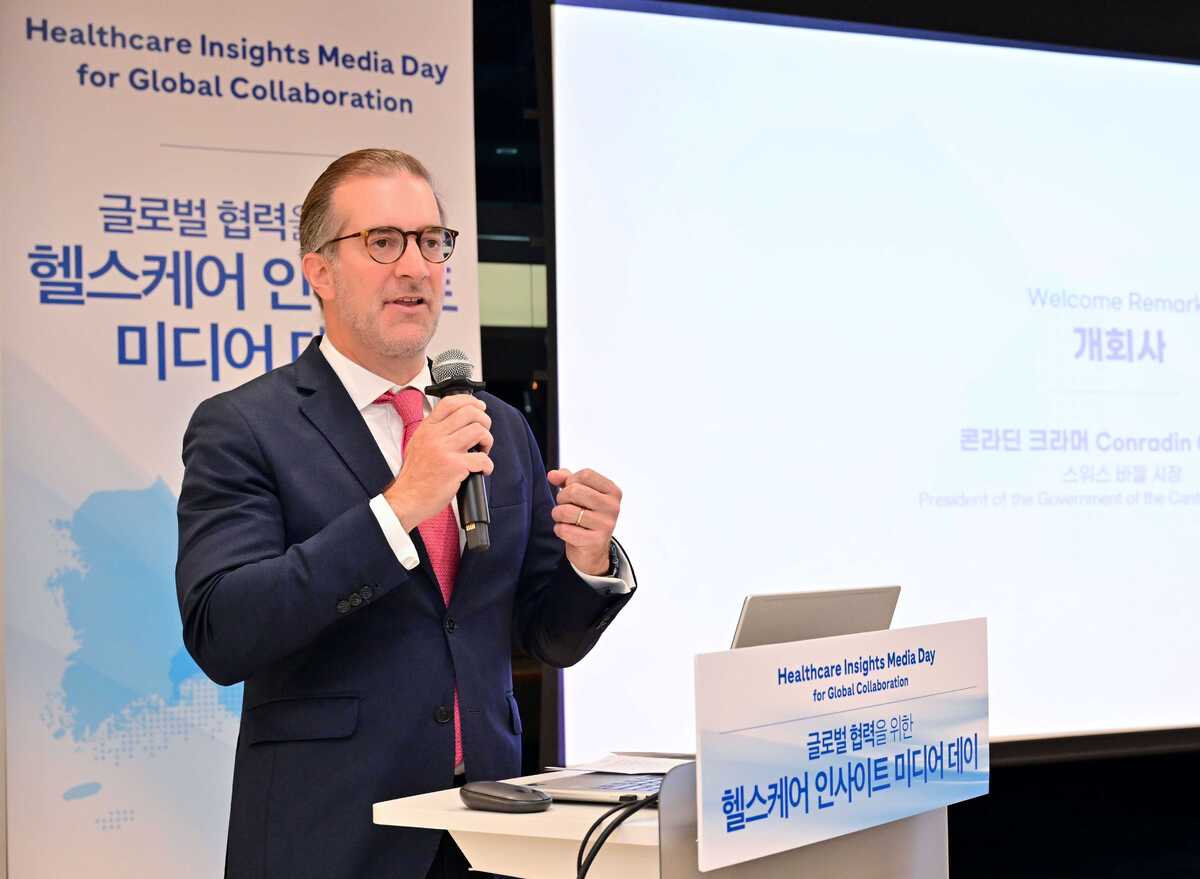 16일 서울 강남구 한국로슈 본사에서 열린 ‘한국로슈 헬스케어 인사이트 미디어데이’에서 콘라딘 크라머 스위스 바젤 시장이 이렇게 말하자, 행사장 분위기가 한층 진지해졌다. 세계적 제약 중심지 바젤의 시장이 직접 한국을 찾아 “바젤이 150년 전부터 로슈와 함께 제약 혁신을 이끌어왔다”고 강조하는 대목이었다. 150년 넘게 제약 산업의 중심지로 자리 잡은 바젤의 시장다운 말이었다.