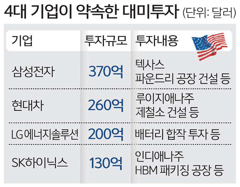 트럼프 대통령의 투자 요청에 국내 기업들은 앞서 발표한 대미 투자 계획을 강조할 것으로 보인다. 삼성전자는 텍사스주 파운드리 공장 등에 370억달러(약 51조7000억원) 투자를 약속했고, 현대차와 SK하이닉스, LG에너지솔루션 등도 각각 수십조원 규모의 대미 투자 계획을 밝힌 바 있다. 한화는 한·미 조선 협력 프로젝트인 ‘마스가(MASGA)’ 논의에 주력할 전망이다.