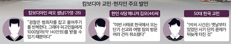 다만 일부 현지인들은 이번 사태로 범죄단지 내 실태를 알게 됐다고 했다. 프놈펜 경찰청에서 통역 일을 하는 싸오 썸낭(가명·28)은 “(범죄단지에 있는) 한국인들은 외국인이기 때문에 출입 제한이 강한 것으로만 알았지, 단지 내 가혹 행위는 자세히 알지 못했다”며 “캄보디아인들은 범죄단지(웬치)에 대해 잘 알 수 없는데 박씨 사건의 전말을 알고 마음이 좋지 않았다”고 덧붙였다.