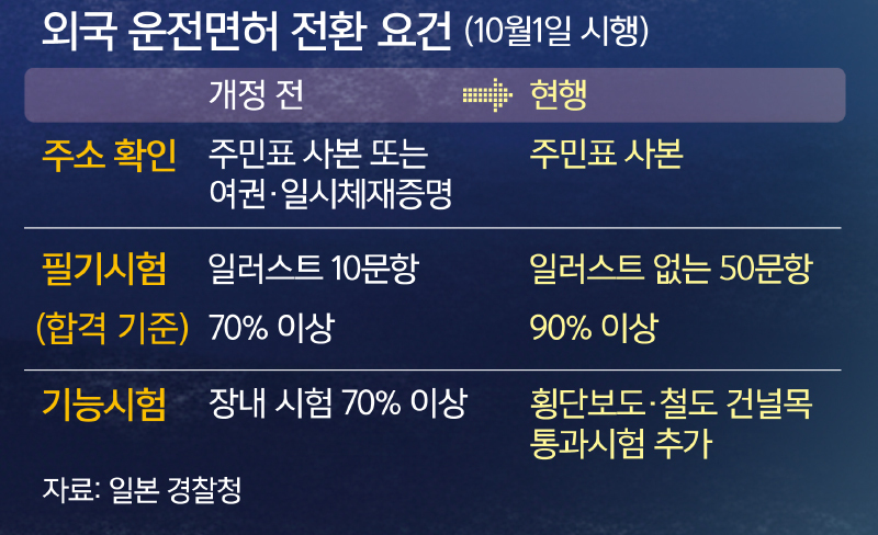 이달 1일부터는 외국에서 발급받은 운전면허증을 일본 내 면허로 전환하는 것도 까다로워졌다. 기존에는 호텔 등 일시 체류 장소를 주소지로 적어 낼 수 있었지만 이제 주민표(한국의 주민등록등본에 해당) 사본 제출이 의무화돼 단기 체류자의 면허 전환이 사실상 불가능하다. 필기시험은 삽화가 있는 10문제에서 지문만 있는 50문제로 늘었고, 합격에 필요한 정답률도 70%에서 90%로 상향됐다. 기능시험에도 횡단보도, 철도 건널목 통과 등이 추가됐고, 좌·우회전 등에 관한 채점이 엄격해졌다.