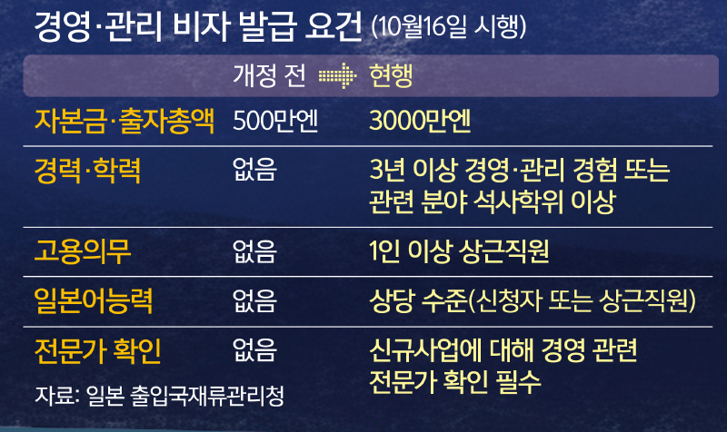 지난 16일부터 새 규정이 시행됨에 따라 이제는 기존보다 6배 많은 3000만엔(2억8300만원) 이상 자본금이 있어야 비자를 받을 수 있다. 여기에 상근 직원 1명 이상 고용 의무가 추가됐고 경력·학력 요건도 생겼다. 비자 발급 신청자나 상근 직원 중 1명은 중상급 수준의 일본어 능력도 갖춰야 한다.