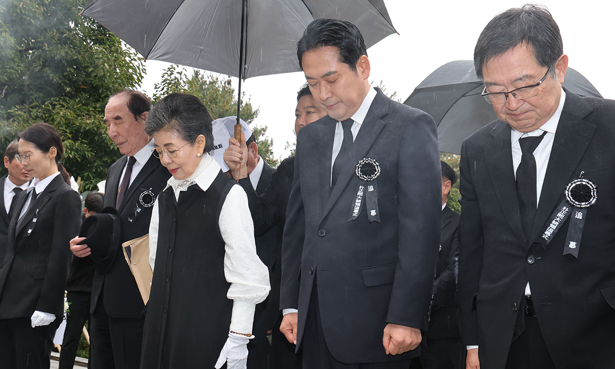 국민의힘 장동혁 대표(왼쪽 네 번째)가 26일 서울 동작구 국립서울현충원에서 열린 박정희 전 대통령 서거 46주기 추모식에서 헌화·분향한 뒤 박 전 대통령 차녀 박근령 전 육영재단 이사장(〃 세 번째), 삼남 박지만 EG 회장(〃 다섯 번째) 등과 묵념하고 있다.