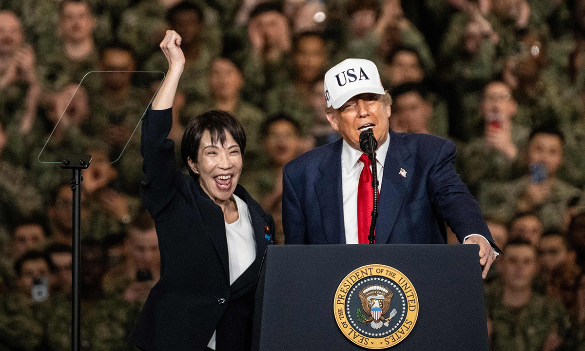 도널드 트럼프 미국 대통령(오른쪽)이 28일 다카이치 사나에 일본 총리와 함께 일본 가나가와현 요코스카의 미 해군기지에 정박한 핵추진 항공모함 조지워싱턴호를 방문, 단상에 올라 연설하고 있다. 트럼프 대통령이 다카이치 총리에 대해 “승자”라고 말했다.