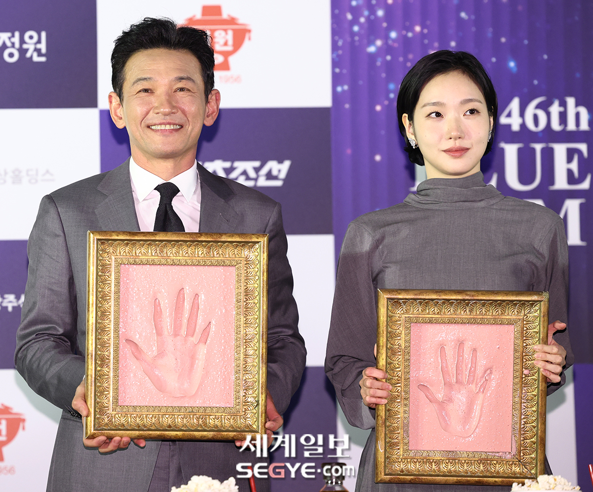 배우 황정민(사진 왼쪽)과 김고은이 29일 서울 여의도 CGV에서 진행된 제46회 청룡영화상 핸드프린팅 행사에 참석해 포즈를 취하고 있다.