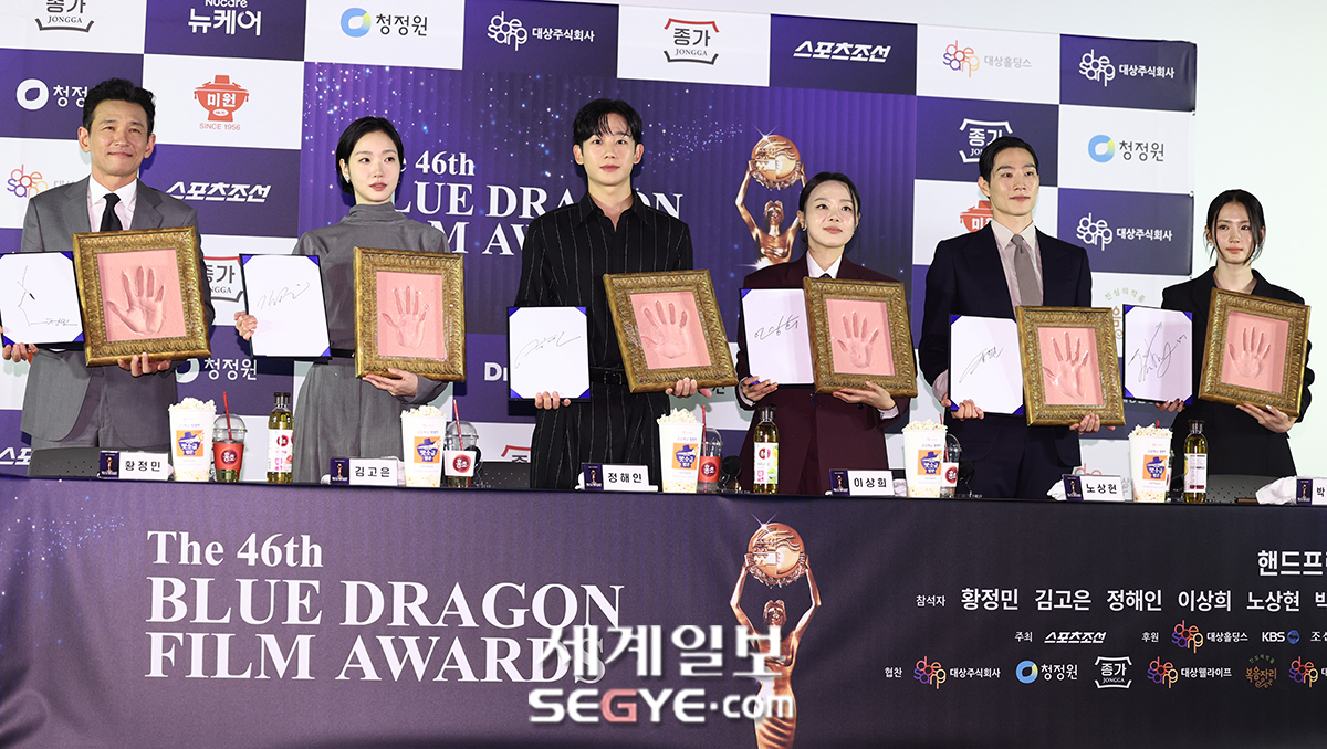 배우 황정민, 김고은, 정해인, 이상희, 노상현, 박주현(사진 왼쪽부터)이 29일 서울 여의도 CGV에서 진행된 제46회 청룡영화상 핸드프린팅 행사에 참석해 포즈를 취하고 있다.