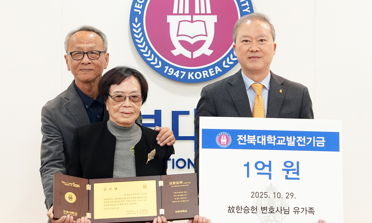 고 한승헌 변호사의 유가족은 29일 전북대학교 총장실에서 열린 발전기금 기증식에서 이같이 말하고 대학에 1억원을 기부했다. 대학 측은 유가족에게 감사패를 전달하고 향후 도서관 운영 방향을 논의했다. 이번 기부금은 법학전문대학원생 장학금과 ‘한승헌도서관’을 중심으로 선생의 정신을 기리는 사업에 사용될 예정이다.
