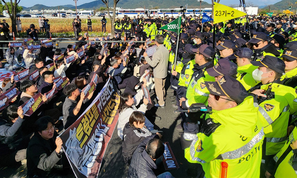 35개 진보 인권단체 등으로 구성된 ‘2025 에이펙 반대 국제민중행동 조직위원회’(이하 국제민중행동)는 이날 오전 경주시 동천동 구황교 인근에서 기자회견을 갖고 “에이펙은 트럼프의 원맨쇼”라며 “에이펙을 명목 삼아 관세 폭탄으로 다른 나라 평범한 사람들의 삶과 경제를 수탈하는 트럼프를 강력 규탄한다”고 밝혔다.