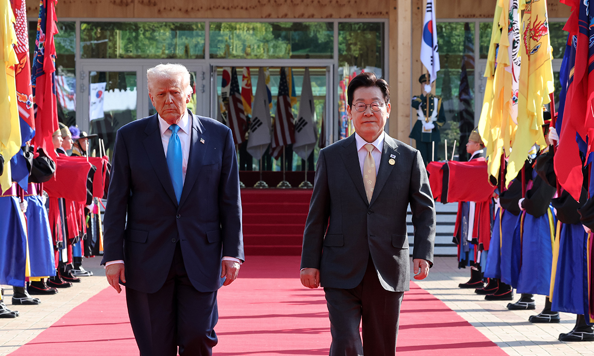 29일 두 번째 한·미 정상회담을 갖고 양국 간 관세협상에 합의한 이재명 대통령과 도널드 트럼프 미국 대통령이 경북 경주박물관에서 회담장으로 이동하고 있다.