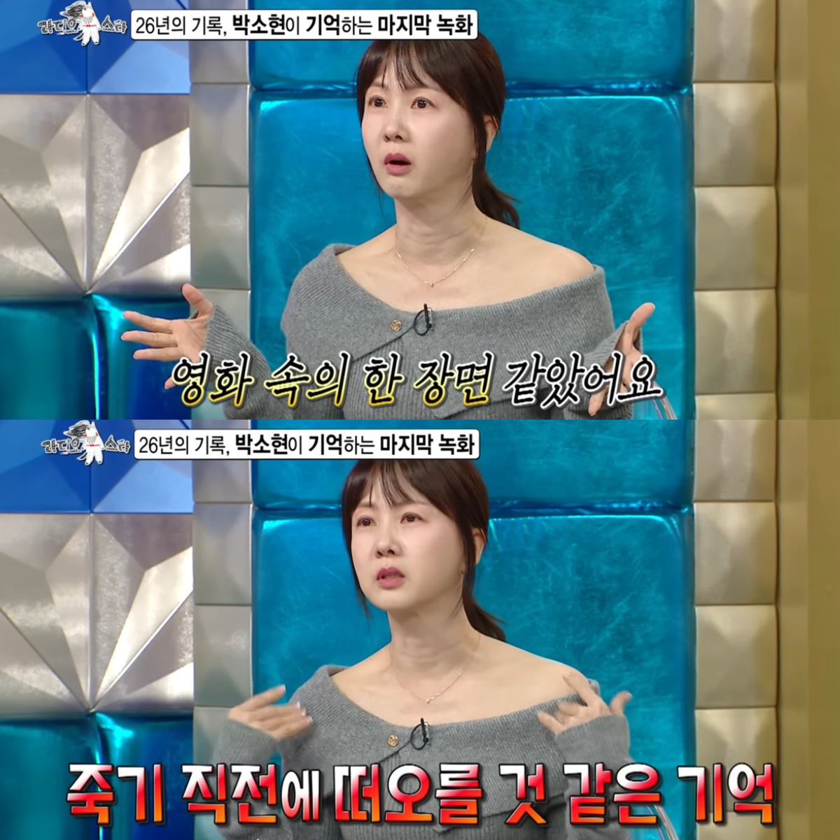 당시에는 눈물을 참으며 프로그램을 잘 마무리해야겠다는 생각에 담담한 모습을 보이던 박소현은 공개된 영상을 보고 끝내 참았던 눈물을 터트리며 “저 때는 제정신이 아니었다”라면서 “방송에서는 안 울었는데 녹화가 끝나고 나서야 눈물이 막 쏟아졌다”고 심경을 전했다.