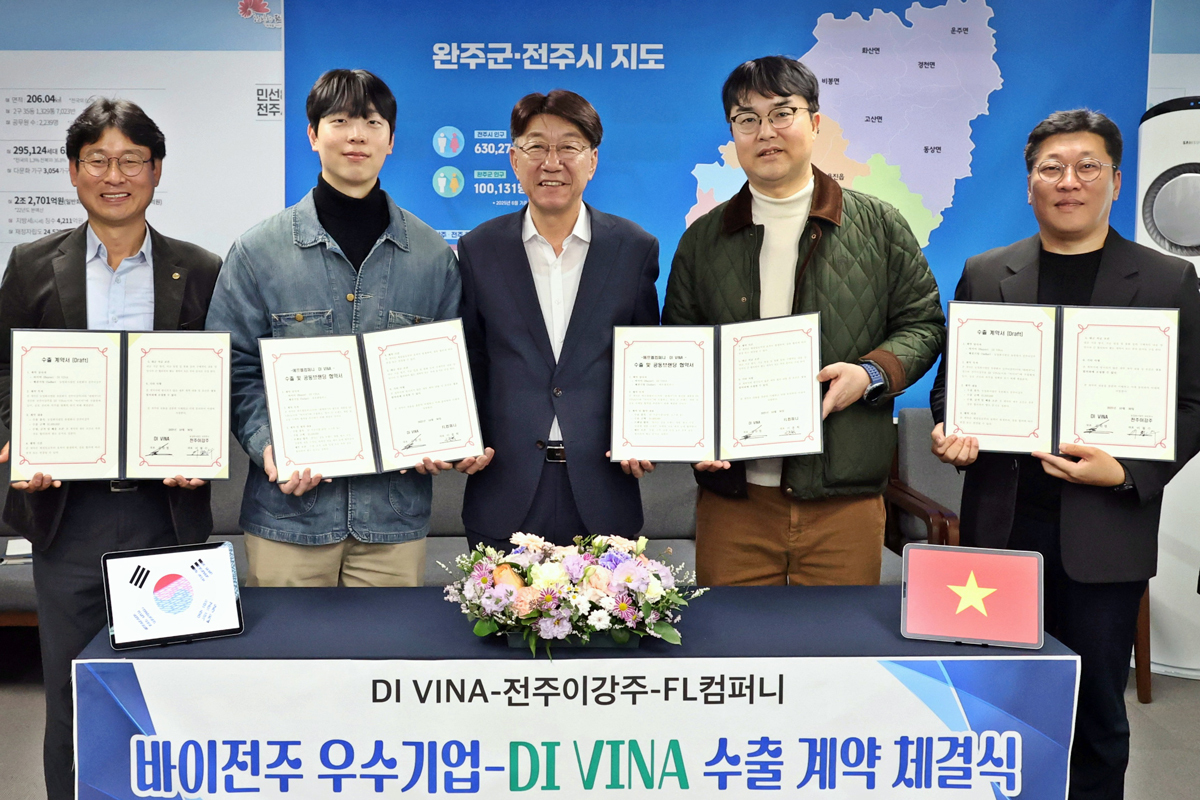 30일 전주시에 따르면 ‘바이전주((BYE JEONJU)’ 우수기업 2곳이 최근 베트남 DI VINA사와 총 200만달러(약 28억원) 규모의 수출 계약을 체결했다. 전주이강주는 100만달러 상당의 이강주 수출 계약을 맺고 본격적인 동남아 시장 공략에 나섰고, 닭 가공식품 전문 기업 에프엘컴퍼니도 같은 규모의 수출 및 공동 브랜딩 협약을 체결해 현지 맞춤형 한식 가공식품 개발에 돌입한다.