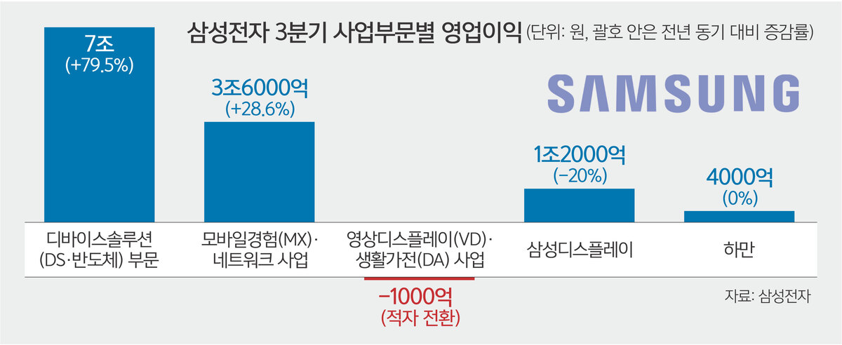 삼성전자 반도체 사업을 담당하는 디바이스솔루션(DS)부문이 올해 3분기 기록한 영업이익 7조원은 지난해 3분기(3조9000억원) 대비 79.5% 높고, 직전 분기(4000억원)의 17배가 넘는 수치다.