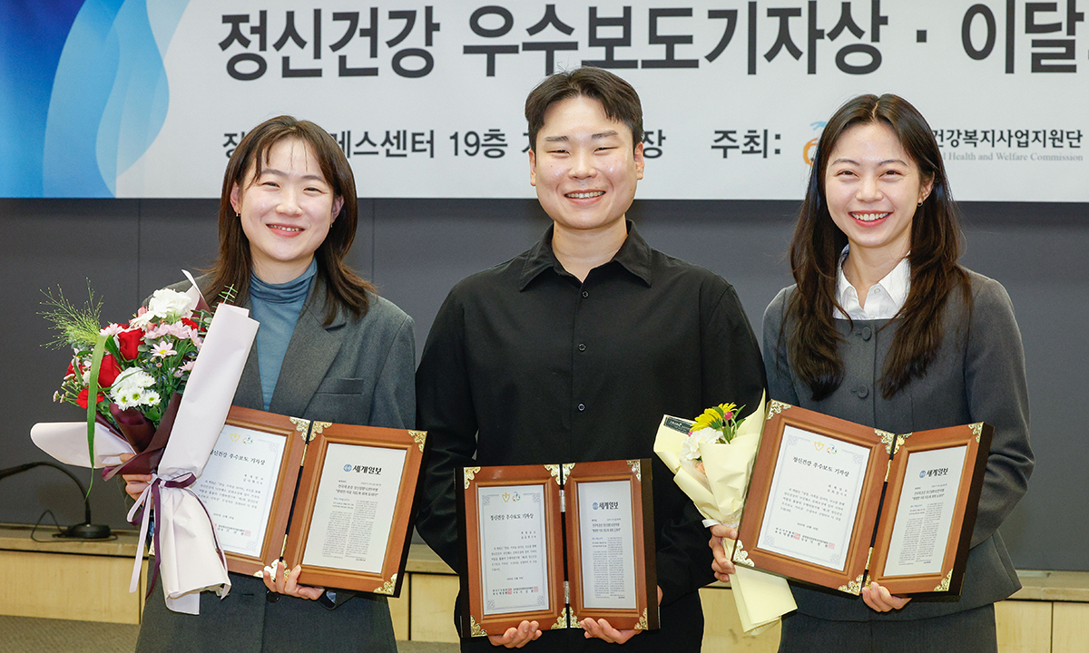 세계일보 김나현(왼쪽부터), 윤준호, 조희연 기자가 30일 서울 중구 한국프레스센터에서 기획보도 ‘망상, 가족을 삼키다’로 제1회 정신건강 우수보도 기자상을 수상한 후 기념촬영을 하고 있다.
