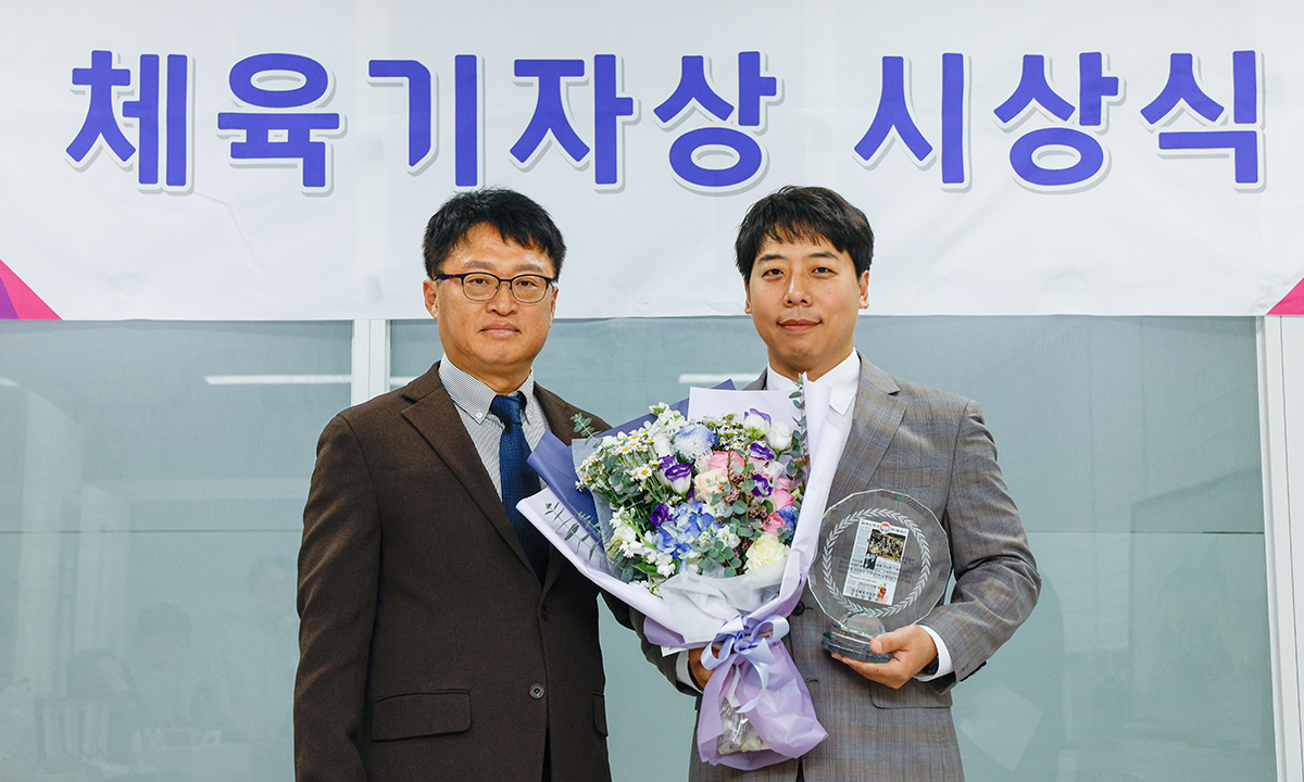 세계일보 정필재 기자(오른쪽)가 30일 서울 송파구 한국체육기자연맹 사무실에서 열린 2025년 3분기 체육기자상 시상식에서 ‘골프계 손기정 연덕춘 84년 만에 이름 찾는다’는 기사로 수상한 후 양종구 체육기자연맹 회장과 기념촬영을 하고 있다.
