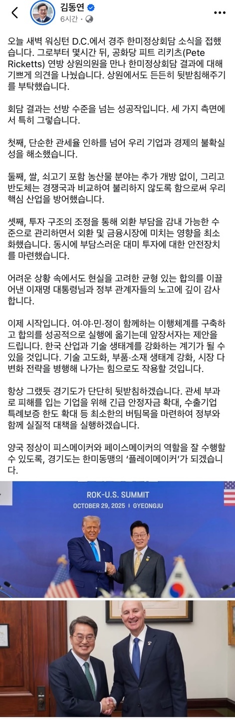 김 지사는 30일 자신의 페이스북에 올린 글에서 “이재명 대통령과 정부 관계자들이 어려운 상황에서도 균형 있는 합의를 끌어냈다. (한미 정상회담은) 선방 수준을 넘어선 성공작”이라고 평가했다.