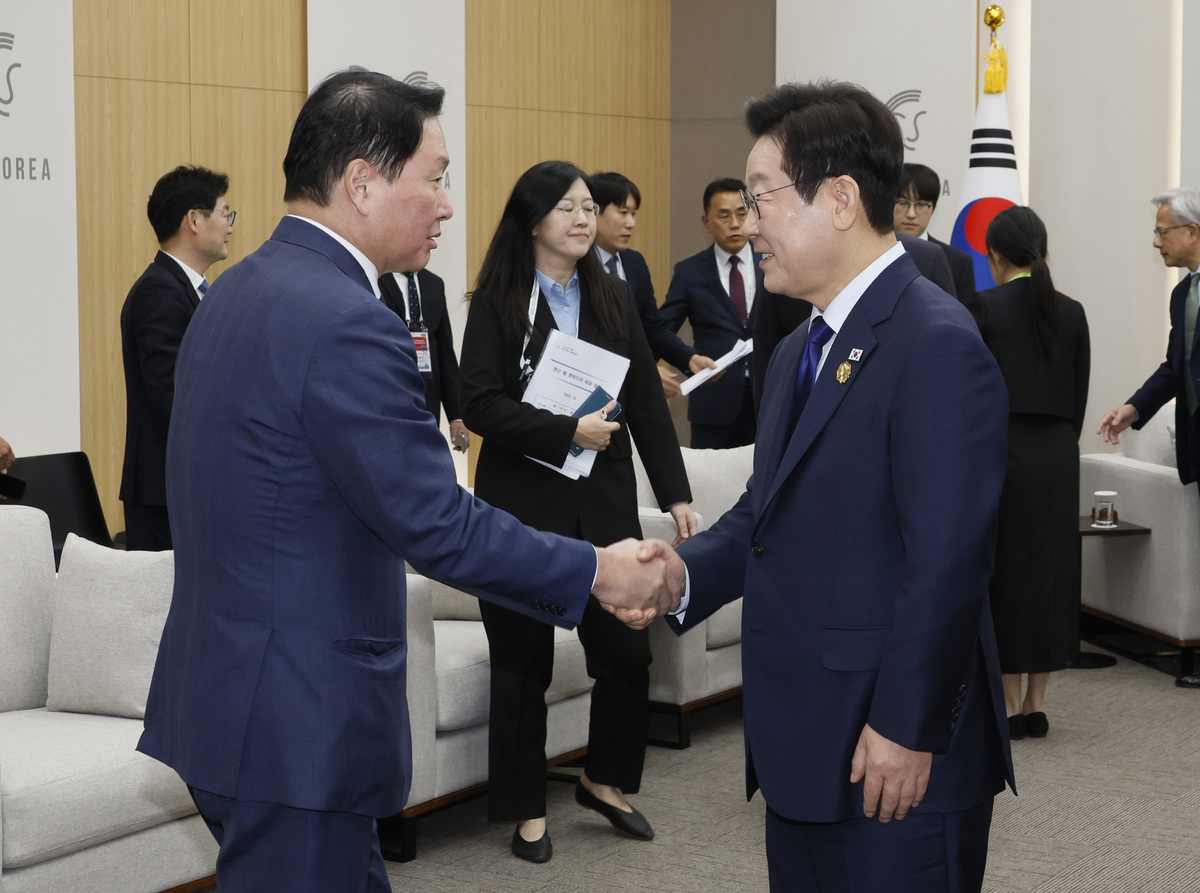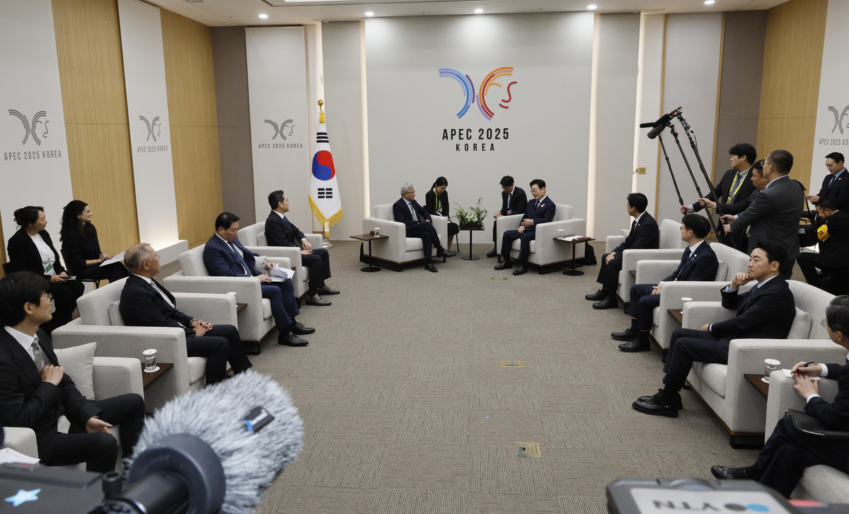 이재명 대통령이 31일 경북 경주화백컨벤션센터(HICO)에서 젠슨 황 엔비디아(NVIDIA) 대표를 접견했다.