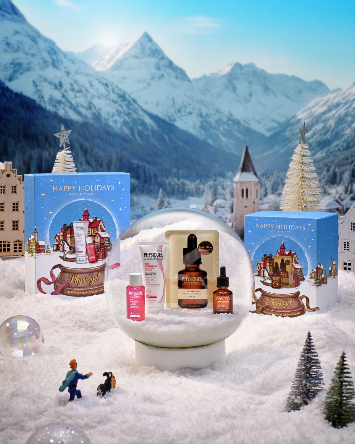 홀리데이 에디션의 패키지 디자인은 스노우볼 안에 자리한 피지오겔 제품을 중심으로, 주변을 감싸는 따뜻한 빛과 작은 마을의 풍경을 감성적으로 담아냈다.