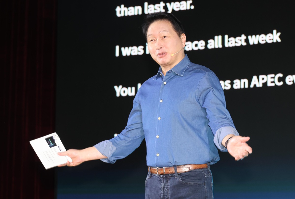 최태원 SK그룹 회장이 3일 서울 강남구 삼성동 코엑스 오디토리움에서 열린 'SK AI 서밋 2025' 키노트 세션에서 'AI Now & Next'를 주제로 기조연설을 하고 있다.