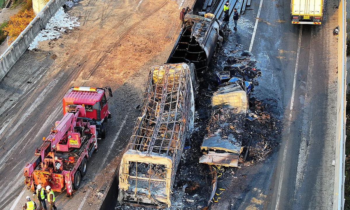 사고 당시 일부 차량에서 발생한 화재는 약 2시간 30여분에 모두 진화됐지만 현장 수습에 시간이 걸리면서 주변 일대 양방향 통행이 3시간째 제한되고 있다.