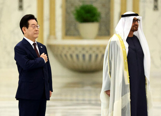 아랍에미리트(UAE)를 국빈 방문 중인 이재명 대통령이 18일(현지시간) 대통령궁에 도착해 무함마드 빈 자이드 알 나흐얀 대통령과 57분간 정상회담을 했다.