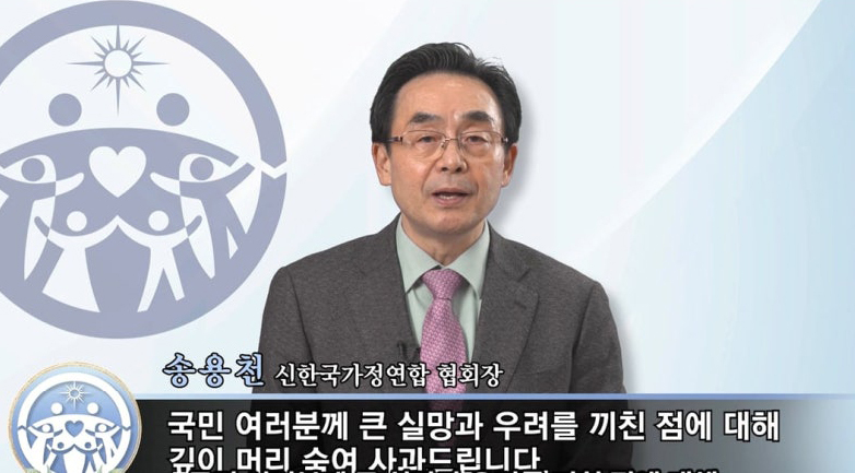 세계평화통일가정연합 한국협회의 송용천 협회장은 11일 공개한 영상에서 “국민여러분께 큰 실망과 우려를 끼친 점에 대해서 깊이 머리 숙여 사과드린다”고 말했다. 송 협회장은 “저희 교단은 조직 차원에서 정치 권력과 결탁하거나 특정 정당을 지원해 이익을 얻으려는 계획이나 의도를 가진 적이 없다”며 “가정연합이 진정 추구하는 바는 가정·사회·국가·인류의 화합이며 특정 정당을 지지하거나 배격하는 활동과는 무관하다”고 주장했다.