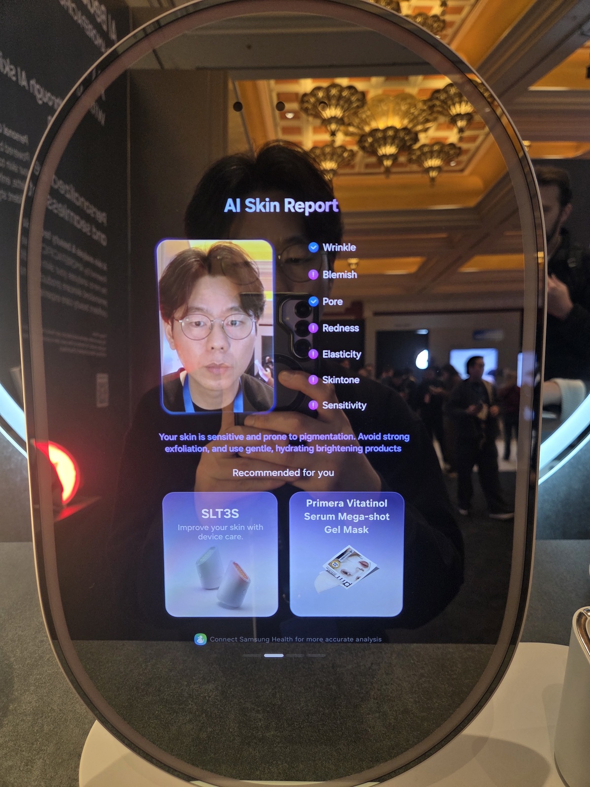 다음으로 방문한 곳은 삼성전자가 아모레퍼시픽과 협업해 내놓은 ‘AI 뷰티 미러’ 코너다. 거울에 10초 가량 얼굴을 인식시키는 것 만으로도 사용자의 피부 상태를 자세하게 진단해줬다. AI 뷰티 미러는 기자가 주름살이나 모공은 기준점을 통과했지만 피부 △홍조 △탄력성 △톤 △민감도에서 경고가 내려졌다.