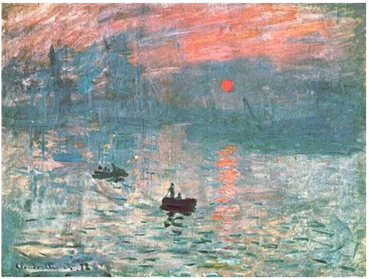 클로드 모네의 ‘일출: 인상’이다. 프랑스 북부 르아브르 항이 아침 일찍 깨어나는 장면을 거칠고 생략된 붓 자국으로 담았다. 풍경이나 인물의 구체적인 모습보다 해가 뜰 때의 시각적인 인상을 강조했다. 그래서 윤곽선과 형태감은 사라졌고, 바다 풍경 가득 메운 색들과 짧게 끊긴 선들과 거친 붓 자국 흔적이 어울린 조화와 뉘앙스만이 두드러진다.
