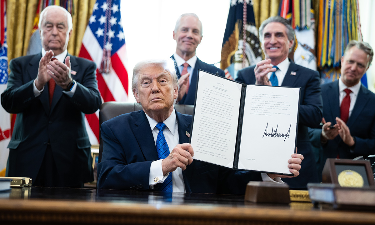 도널드 트럼프 미국 대통령이 30일(현지시간) 백악관 집무실에서 정부 관계자들이 지켜보는 가운데 행정명령에 서명한 뒤 해당 서류를 들어 보이고 있다. EPA연합뉴스