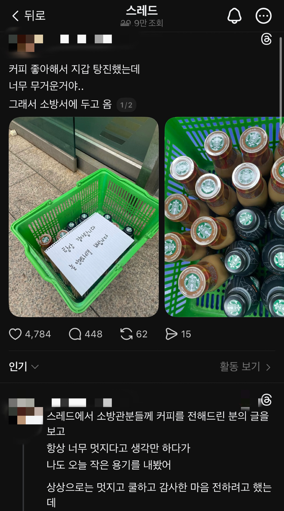 기부에 동참한 배경으로는 “SNS에서 소방관에게 커피를 전한 사연을 접하고 나도 오늘 작은 용기를 냈다”고 밝혔다. 작성자는 소방관에게 항상 멋지다고 생각하고 감사한 마음을 가지고 있었다고 덧붙였다.